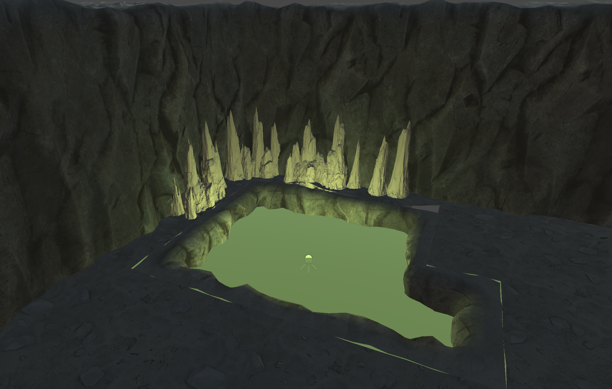 We have been experimenting with potential lighting setups and creating blackouts for environment assets. More details are being added to the game environment as we sculpt rocks and scatter multiple sets of them in the game.