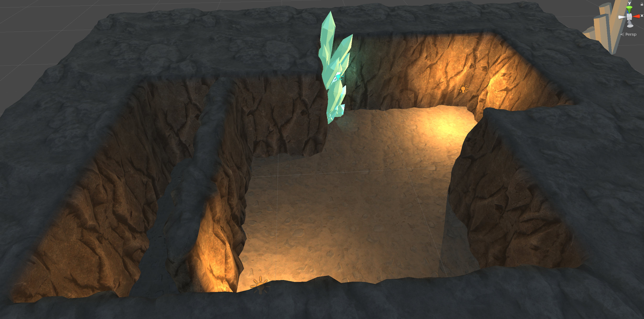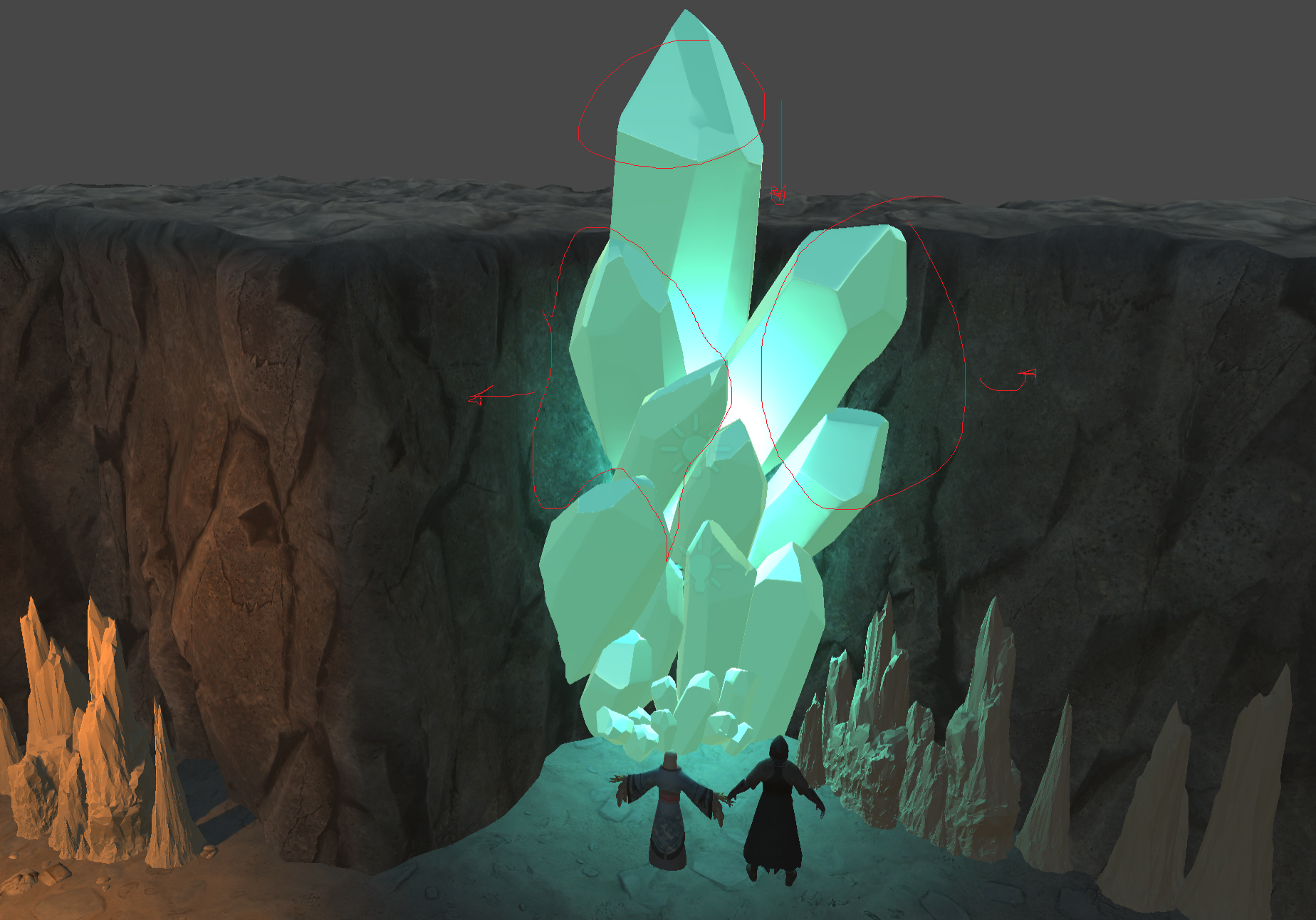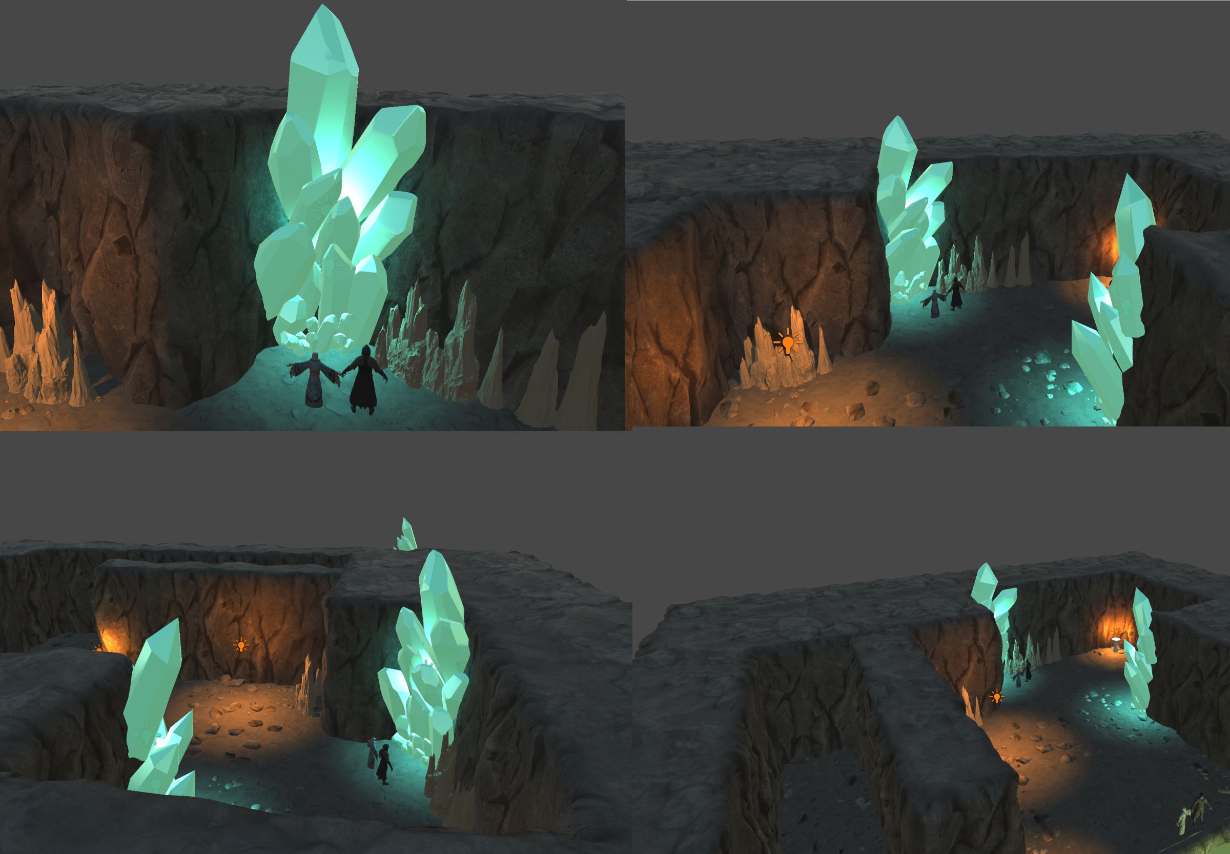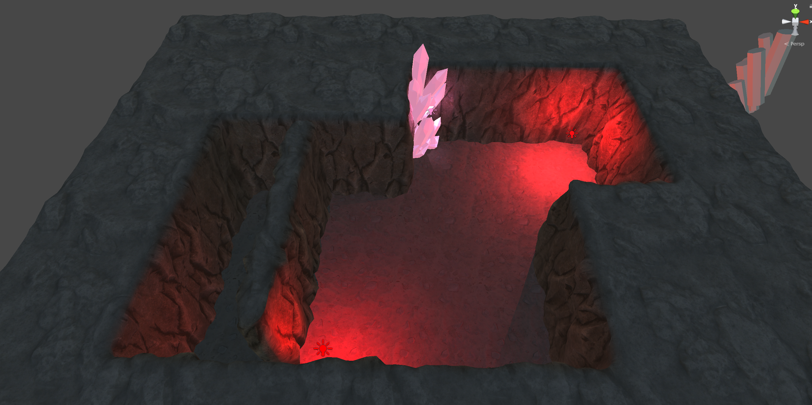 The blockouts from last week allowed our artist to quickly experiment with how big the crystal clusters needed to be, and they were then able to use this knowledge when creating the final models for the environment this week.