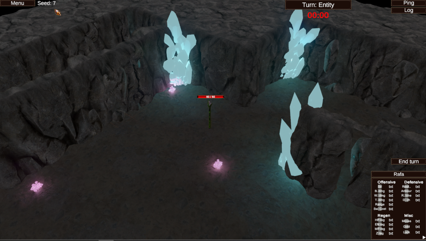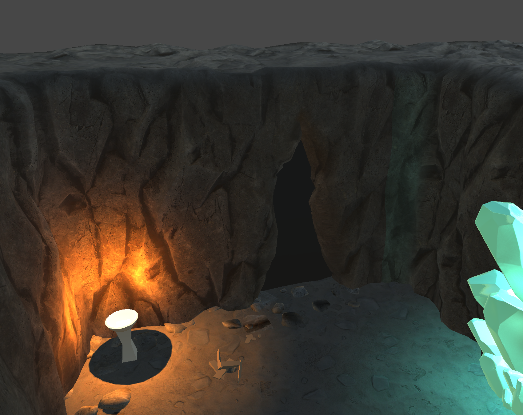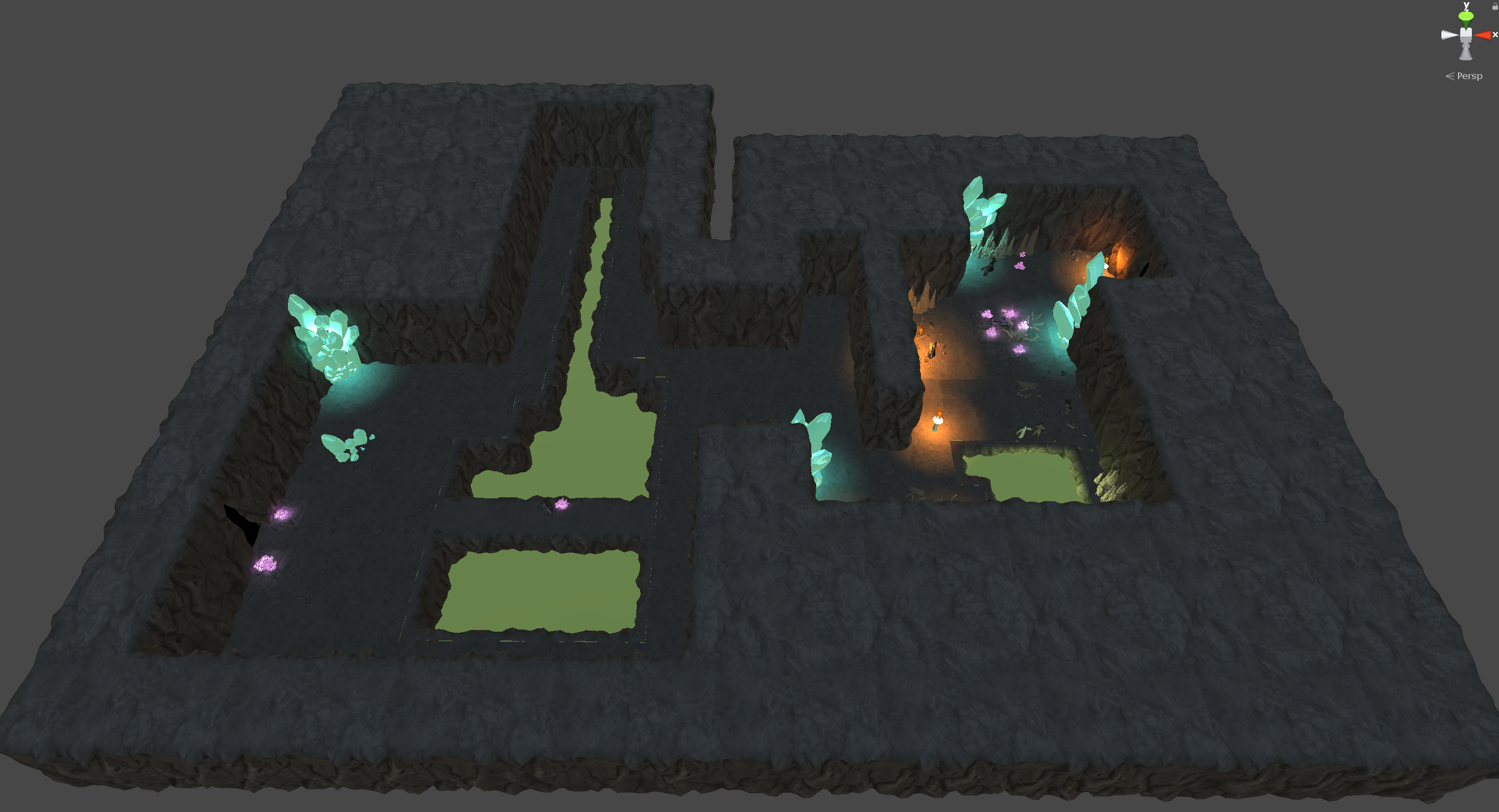 - Crystal Clusters: after our environment artist completed his renders of the crystals, our game developer was able to add some experimental clusters to the game rooms. These glow, emit a pulsating light and spawn randomly in the corners of different rooms.